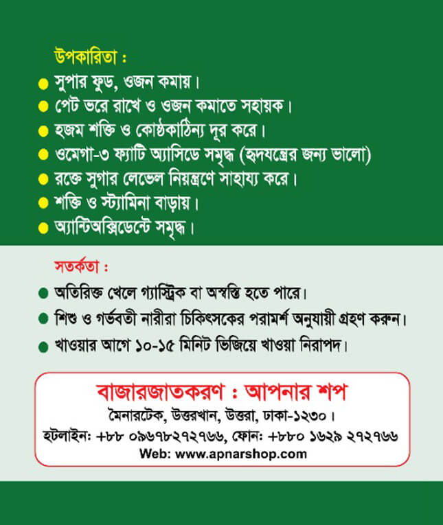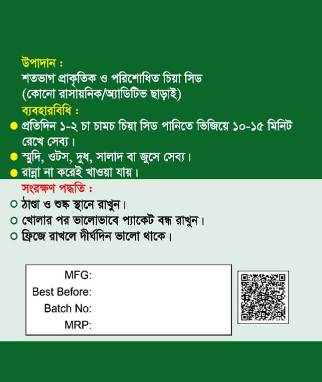 স্বাস্থ্যসম্মত ও নিরাপদ প্যাকেজিংয়ের মাধ্যমে আমাদের চিয়া সিড দীর্ঘদিন পর্যন্ত তাজা থাকে। দৈনন্দিন স্বাস্থ্যচর্চা ও ফিটনেস রুটিনের জন্য এটি একটি নির্ভরযোগ্য ও মানসম্মত পছন্দ।