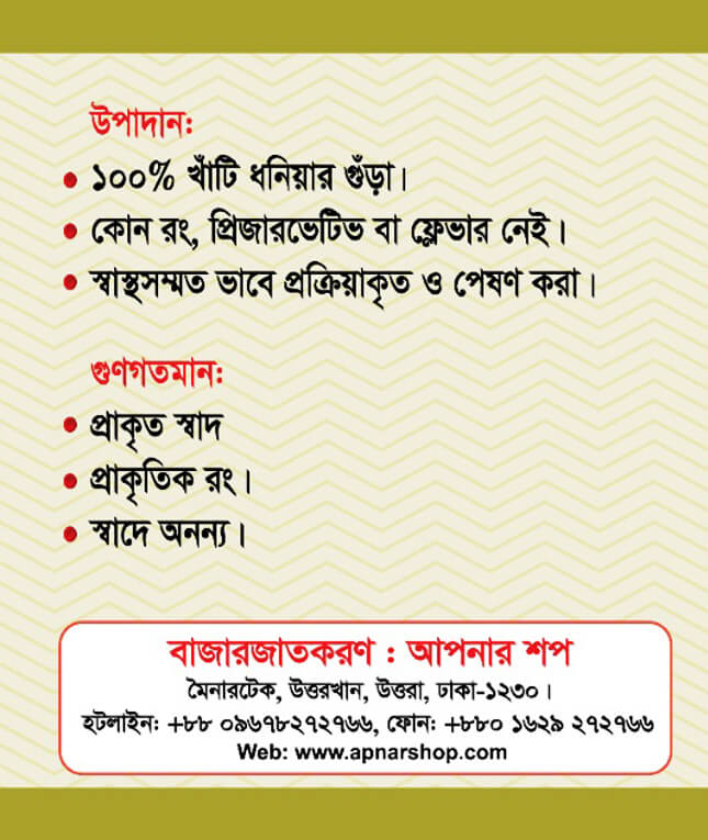 আমাদের ধনিয়ার গুঁড়া সম্পূর্ণ খাঁটি ও ভেজালমুক্ত। এতে কোনো কৃত্রিম রং, ফ্লেভার বা ক্ষতিকর কেমিক্যাল ব্যবহার করা হয়নি। মাংস, মাছ, ডাল, সবজি, ভুনা, তরকারি কিংবা বিভিন্ন মসলা মিশ্রণে এটি ব্যবহার করলে খাবারে আসে অতুলনীয় স্বাদ ও মনমুগ্ধকর ঘ্রাণ।