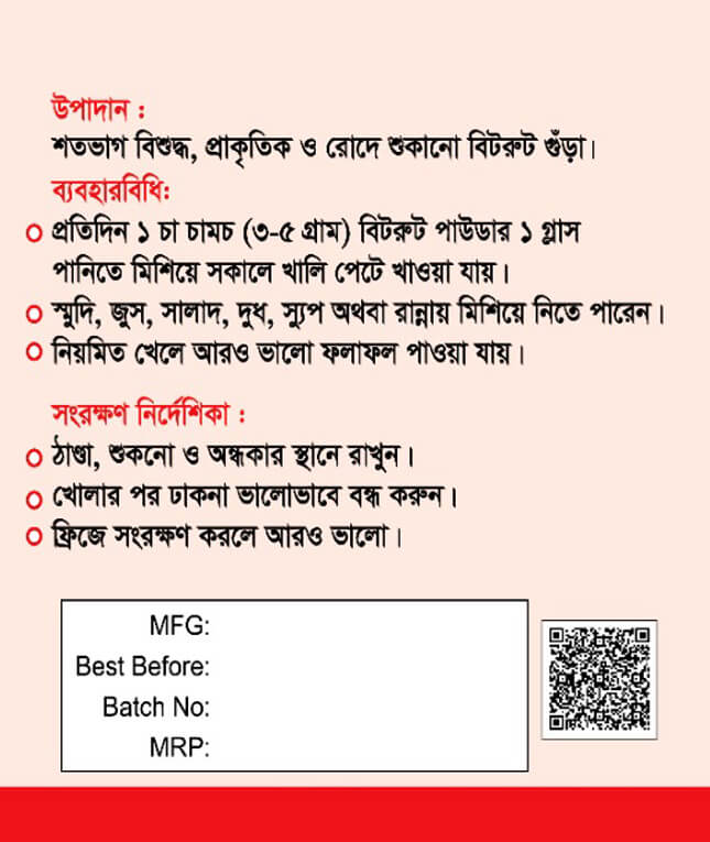 স্বাস্থ্যসম্মত ও নিরাপদ প্যাকেজিংয়ের মাধ্যমে আমাদের বিটরুট পাউডার দীর্ঘদিন পর্যন্ত তাজা থাকে এবং এর গুণগত মান অক্ষুণ্ন থাকে। স্বাস্থ্য সচেতন জীবনযাত্রার জন্য এটি একটি নির্ভরযোগ্য ও মানসম্মত পছন্দ।
