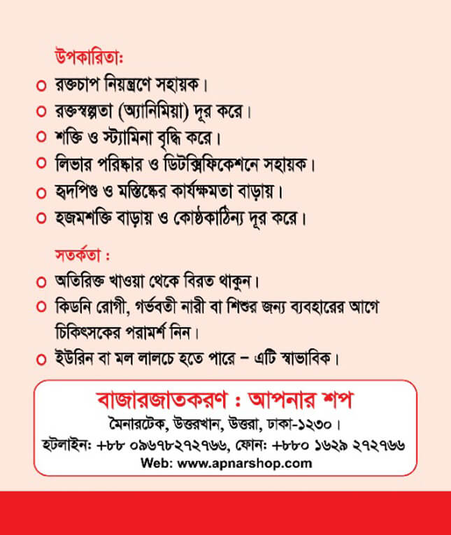 আমাদের বিটরুট পাউডার সম্পূর্ণ খাঁটি ও ভেজালমুক্ত। এতে কোনো কৃত্রিম রং, প্রিজারভেটিভ বা ক্ষতিকর কেমিক্যাল ব্যবহার করা হয়নি। পানি, দুধ, স্মুদি, জুস, দই কিংবা বিভিন্ন স্বাস্থ্যকর খাবারের সাথে সহজেই মিশিয়ে খাওয়া যায়।