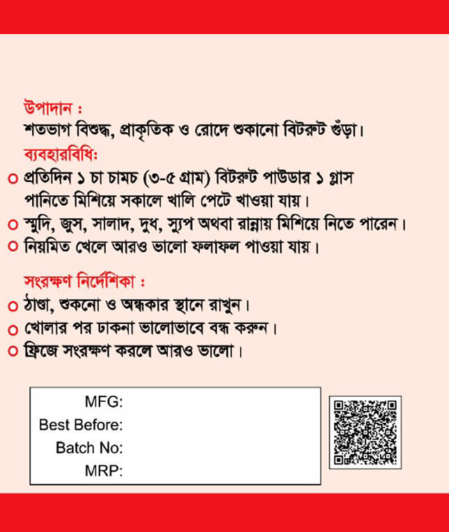 স্বাস্থ্যসম্মত ও নিরাপদ প্যাকেজিংয়ের মাধ্যমে আমাদের বিটরুট পাউডার দীর্ঘদিন পর্যন্ত তাজা থাকে এবং এর গুণগত মান অক্ষুণ্ন থাকে। স্বাস্থ্য সচেতন জীবনযাত্রার জন্য এটি একটি নির্ভরযোগ্য ও মানসম্মত পছন্দ।