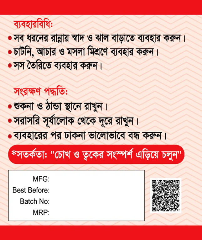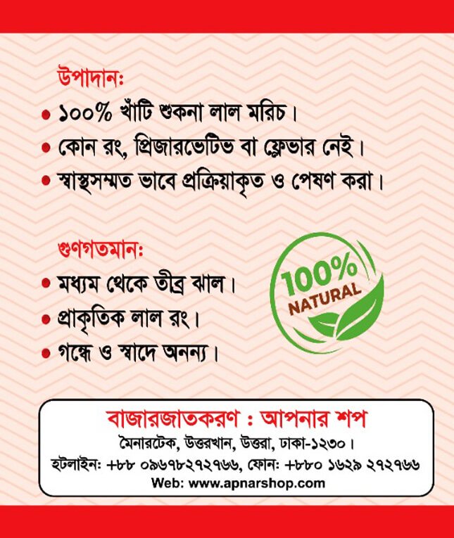 আমাদের মরিচের গুড়া কোনো ধরনের কৃত্রিম রং, রাসায়নিক বা সংরক্ষণকারী ছাড়াই প্রস্তুত করা হয়। তাই এটি স্বাস্থ্যসম্মত ও নিরাপদ। সুগন্ধি, ঝাঁঝালো এবং মানসম্মত এই মরিচের গুড়া আপনার প্রতিদিনের রান্নার জন্য একটি আদর্শ পছন্দ।
