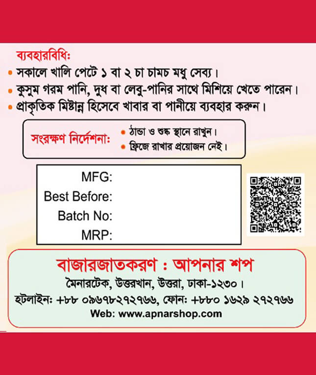 স্বাস্থ্যসম্মত ও নিরাপদ প্যাকেজিংয়ের মাধ্যমে আমাদের লিচু ফুলের মধু দীর্ঘদিন পর্যন্ত তাজা ও মানসম্মত থাকে। খাঁটি ও প্রাকৃতিক মধু পছন্দ করেন এমন সবার জন্য এটি একটি নির্ভরযোগ্য ও প্রিমিয়াম পছন্দ।