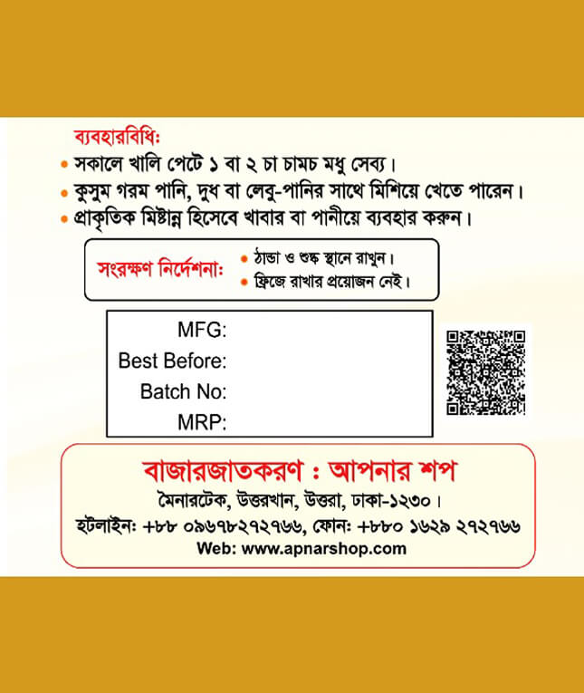 স্বাস্থ্যসম্মত ও নিরাপদ প্যাকেজিংয়ের মাধ্যমে আমাদের সরিষা ফুলের মধু দীর্ঘদিন পর্যন্ত তাজা ও মানসম্মত থাকে। খাঁটি মধু খুঁজছেন এমন সবার জন্য এটি একটি নির্ভরযোগ্য ও প্রাকৃতিক পছন্দ।